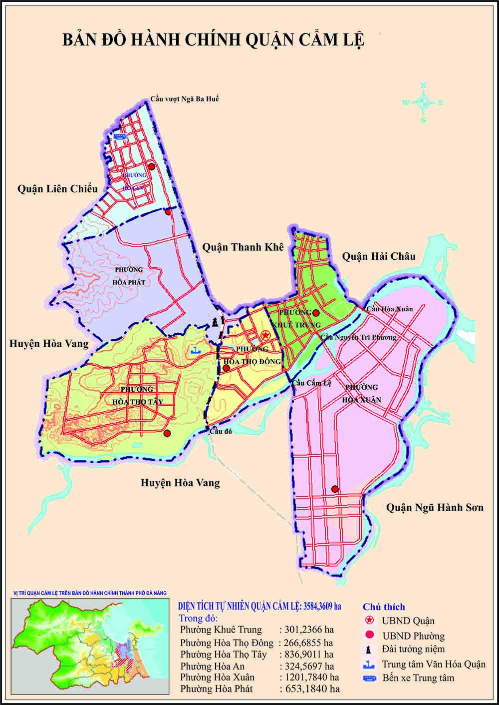 Quận Cẩm Lệ có diện tích 34 km², chiếm 2,63% diện tích toàn thành phố, dân số 143.632 người, chiếm 9,6% số dân toàn thành phố, mật độ dân số đạt 4.224 người/km². Phía đông giáp với Quận Ngũ Hành Sơn, phía Tây Nam giáp Huyện Hòa Vang, phía bắc giáp các quận Liên Chiểu, Thanh Khê và Hải Châu, đây là quận nội thành duy nhất của Đà Nẵng không tiếp giáp với biển. Quận Cẩm Lệ có 6 đơn vị hành chính cấp phường đó là: Hòa An, Hòa Phát, Hòa Thọ Đông, Hòa Thọ Tây, Hòa Xuân, Khuê Trung.