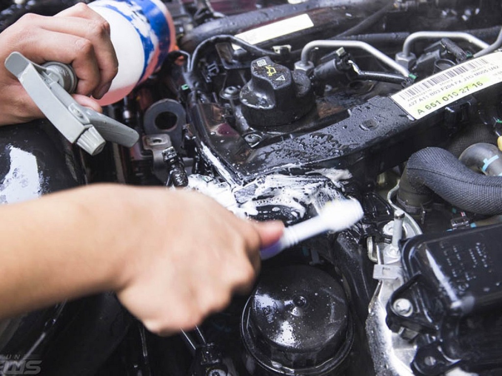 - Bước 3: Sử dụng xịt dung dịch rửa khoang máy ô tô. Bắt đầu xịt dung dịch dung dịch rửa khoang máy ô tô lên các khu vực ở trong khoang máy, sau đó hãy đợi từ 3 đến 5 phút khi dung dịch hòa tan, làm mềm cặn bẩn hay dầu mỡ bám trên các chi tiết. Ngày nay, ở trên thị trường có bán các loại dung dịch chuyên dụng của 3M, Black Magic hoặc Meguiars dùng để vệ sinh khoang động cơ ô tô. Trong trường hợp bạn chăm sóc xe tại nhà, chủ xe nên trang bị những loại dung dịch chuyên dụng thay cho việc sử dụng dùng xà bông bởi vì những sản phẩm sẽ làm ăn mòn các chi tiết kim loại, cao su trong khoang máy.